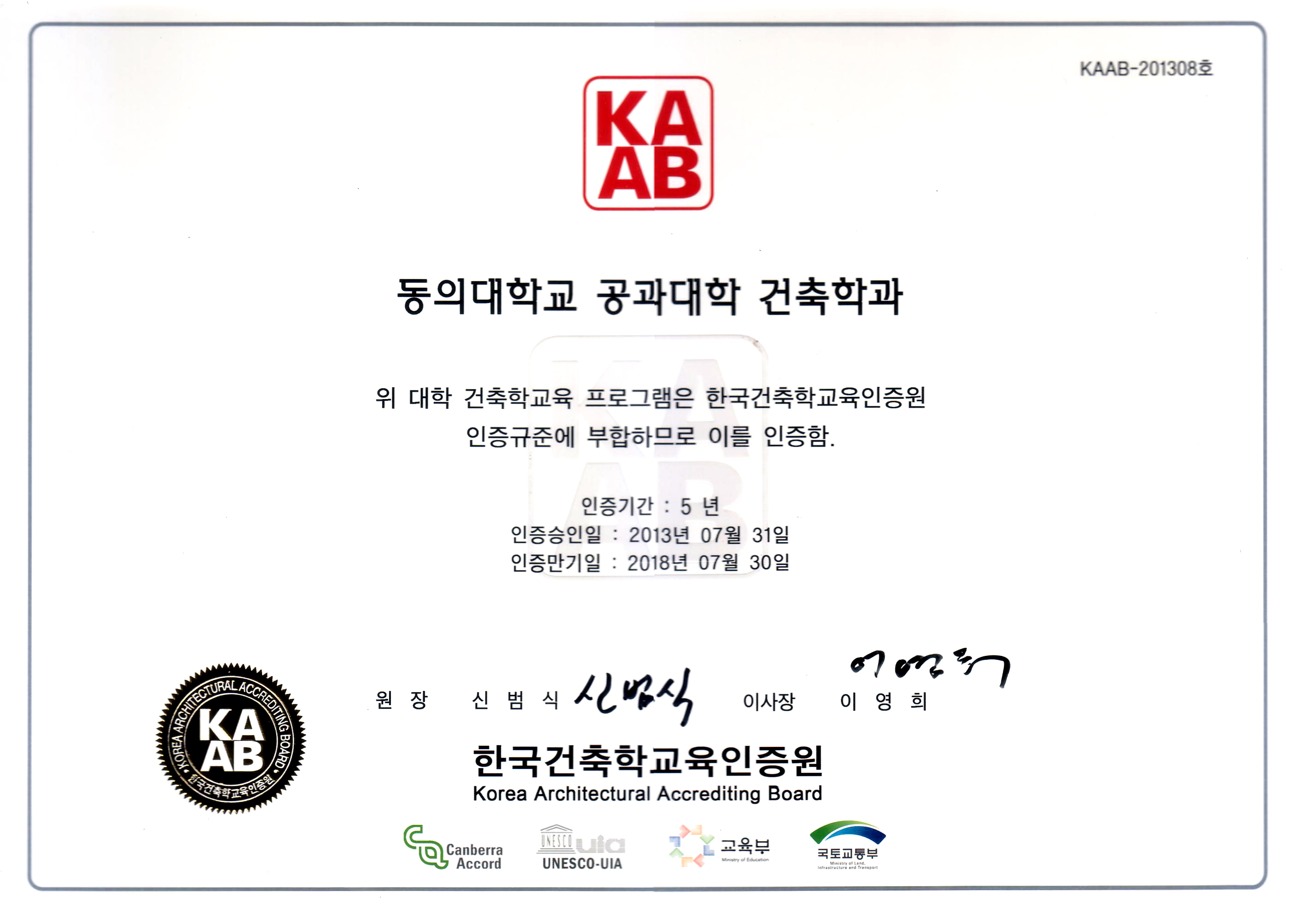 동의대학교의 건축학사학위는 한국건축학교육인증원(KAAB)이 제시하는 인증기준 및 절차를 준수하고 건축학교육 전문학위 인증을 취득한 프로그램으로서, 캔버라협약 (Canberra Accord) 회원 인증기관들과 유네스코-세계건축사연맹(UNESCO-UIA) 건축학교육인증기구(UVCAE)가 동시에 인정하는 전문학위 프로그램이다. 인증 받은 건축학교육 전문학위 취득을 건축사등록원에 등록하는 등록 건축사의 필수 자격 요건으로 명시하고 있는 것은 국제적 추세이다. (www.kaab.or.kr 참조)
