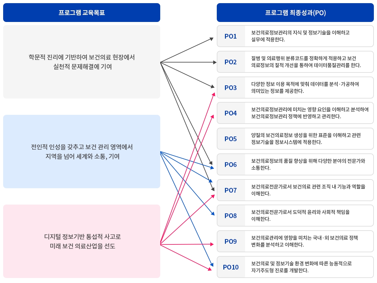 | PO9 | 보건의료관리에 영향을 미치는 국내·외 보건의료정책 변화를 분석하고 이해한다. | PO10 | 보건의료 및 정보기술 환경 변화에 따른 능동적으로 자기주도형 진로를 개발한다. |
