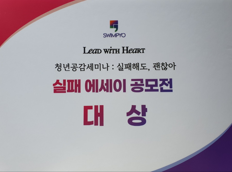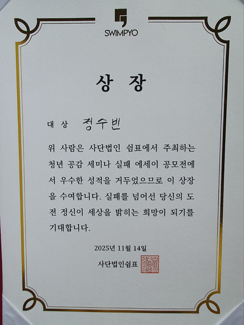국어국문학과에 재학 중인 정수빈(22) 학우가 <사단법인 쉼표>에서 주최하는 <청년 공감 세미나 실패 에세이 공모전>에서 대상을 받았습니다.