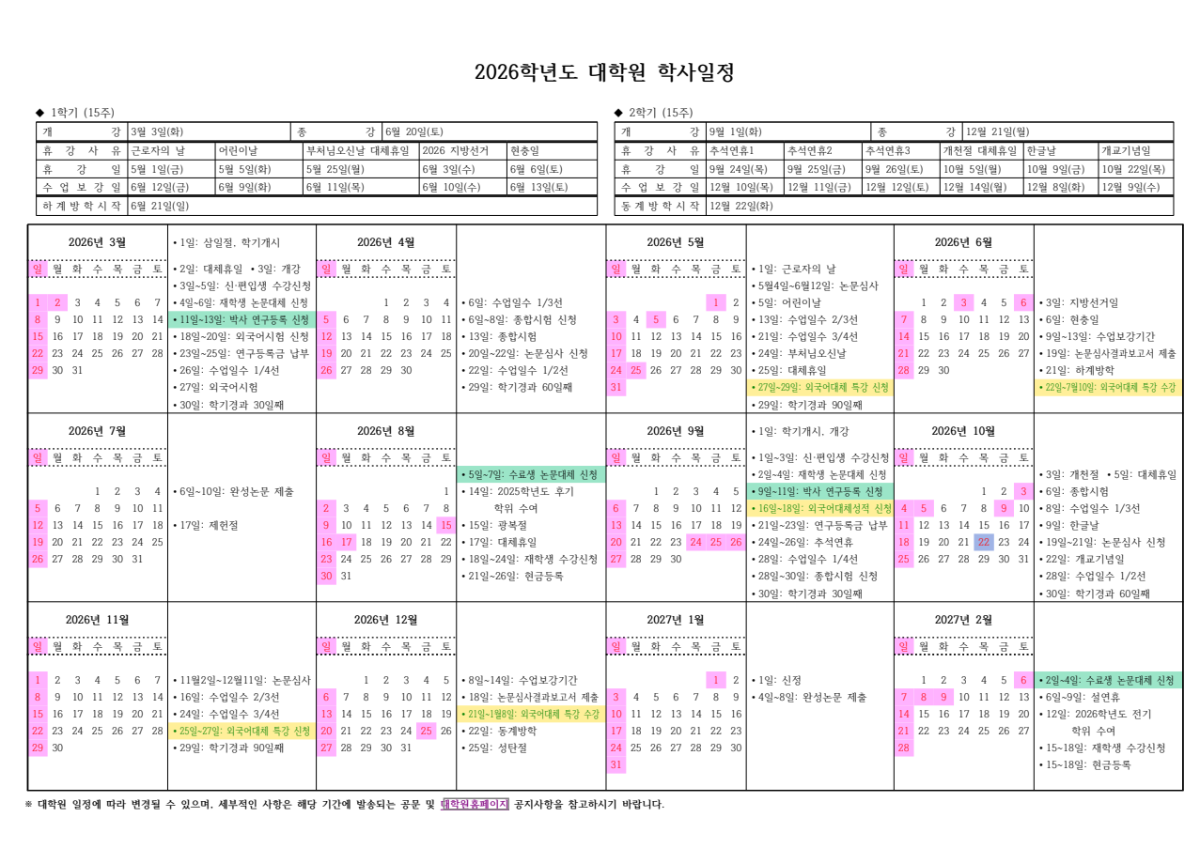 1. 2026학년도 대학원 학사일정을 붙임과 같이 확정하여 알려드립니다.