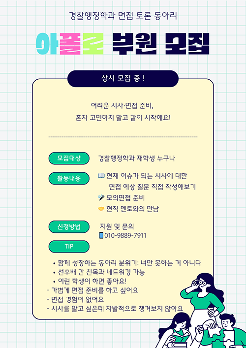 재학생들이 학기 및 방학 스터디를 통해 희망 진로에 함께 나아가기 위한 목적으로 기사·도서를 통해 시사 이슈를 파악하여 시사 상식 능력을 향상시키는 데 주력합니다. 관련 주제 선정 후 자유로운 토의 활동을 통해 다양한 시각을 기르며, 시사와 관련된 면접 예상 질문을 직접 작성해 보며 실질적인 면접 준비를 하기 위해 모임을 운영하고 있습니다. 현직 경찰공무원인 선배들을 초청하여 동아리에 대한 방향성을 함께 모색하고자 합니다.