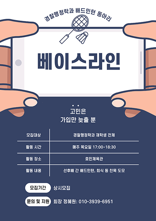 "베이스라인"은 경찰행정학과의 배드민턴 동아리입니다. 베이스라인은 경찰행정학과의 재학생, 교수 및 조교선생님들과 함께 활동하는 동아리로 시간적 제약으로 인해 수업시간에 하지 못하는 많은 이야기들을 공통으로 관심을 가지고 있는 배드민턴을 통해 구성원들간 이해도를 높이고, 단합을 강화하며, 학교 생활에 관한 다양한 의견을 교환하고 있습니다.