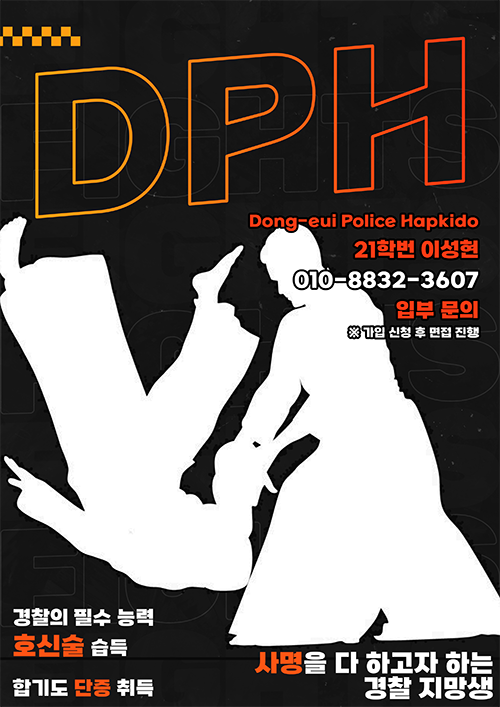 경찰행정학과 합기도 호신술 동아리 'D.P.H(DEU Police-Administration Hapkido)'는 범죄 현장 속에서 갖가지 위험을 마주해야하는 경찰후보생들이 안전하게 자신을 보호하며 그 사명을 다 할 수 있도록, 합기도를 기반으로 호신술을 단련하기 위해 개설되었습니다. 주 3회 정기 수련 속 현재 운영 중인 도장과의 연계하여 전문적이고, 세심한 지도를 통해 초보자도 쉽고 정확한 기술을 익힙니다. 또한 위험과 직면하고 직접 대처해야 하는 '경찰'로서의 기초 신체 능력 및 강인함을 기르는 등 몸과 마음가짐 모두를 길러내는 것을 목표로 합니다. 추가로 경찰 시험의 유일한 자격증 점수를 얻기 위해서 단증 취득에 중점을 둔 '승단반'을 별도 운영하여 타 경찰지망생들과 차별점을 가질 수 있게 합니다.
