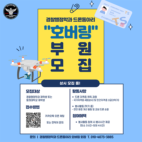 '호버링'이란 제자리비행을 뜻합니다. 드론을 안정적으로 제자리비행하기 위해서는 많은 연습과 전문성이 필요합니다. "호버링" 동아리는 인공지능기술 및 사물인터넷, 빅데이터 등 정보통신기술(ICT)과의 융합이 강조되는 4차산업혁명 시대의 특징을 선도적으로 이해하고, 특히 다양한 분야에서 활용되고 있는 드론의 특성과 조작법 등을 이해함으로써 봉사 활동 및 순찰 활동을 하기 위한 모임입니다.