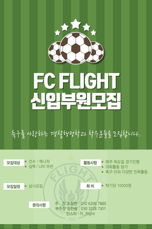 "FC 플라이트"는 경찰행정학과의 축구 동아리입니다. 경찰행정학과의 축구 동아리는 단과대학 체육대회에서 다수의 우승 경력을 가지고 있고, 교외에서도 다양한 친선대회를 통해 그 실력을 인정 받고 있습니다. 또한, 재학생뿐만 아니라 졸업한 선배들과 축구라는 공통 관심사를 통해 졸업 이후에도 지속적인 교류가 이루어지고 있는 동아리입니다.