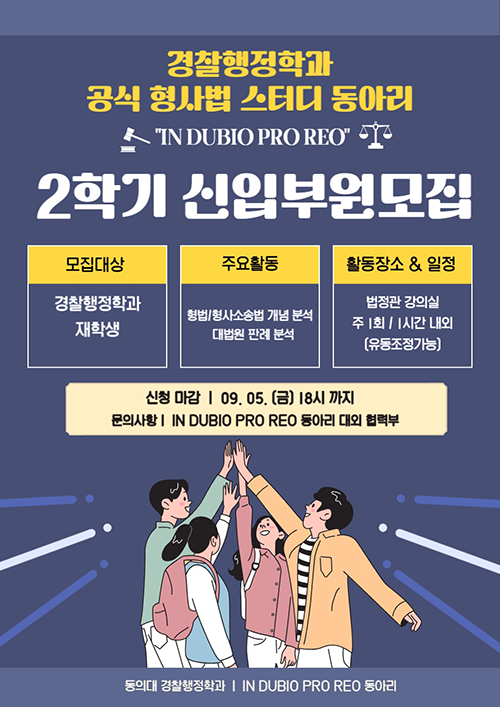 'in dubio pro reo'는 ‘의심스러울 때는 피고인의 이익으로’라는 의미로 무죄추정의 원칙, 형사소송법 대원칙입니다. 법원직, 검찰직, 경찰직, 철도경찰직 등 공직을 지향하는 학생들이 모여 대학교에서의 학문적 탐구뿐만 아니라 형법, 형사소송법 등 수험 과목을 체계적으로 우선적 학습하여 향후 수험 준비에 효과적으로 대비함을 목표로 합니다. 또한, 리걸 마인드(legal mind)의 확립을 도모하고, 선후배 간의 유기적인 교류의 장을 마련하며, 다양한 직렬의 시험을 준비하는 학우들과의 상호 교류를 통해 인적 네트워크를 구축하는 데 중점을 둠으로써, 법학적 전문성 등을 배양하고자 합니다.