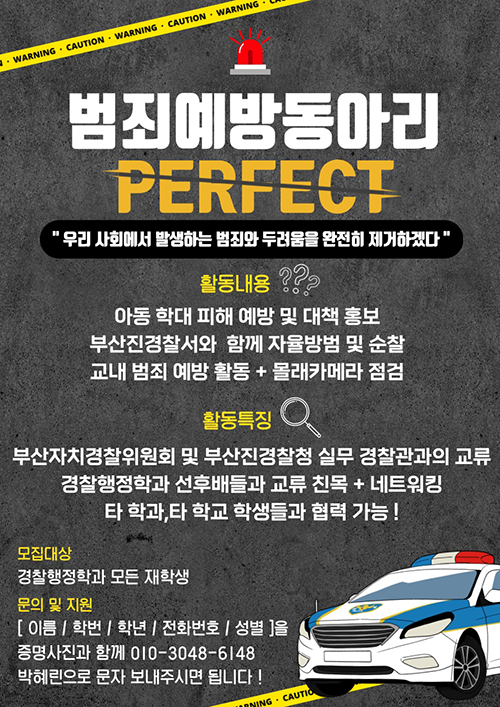 범죄 예방 동아리 "퍼펙트(Perfect)"는 '우리 사회에서 발생하고 있는 범죄와 범죄로 인한 두려움을 완전히(Perfect) 제거하겠다는 의미'로 만들어진 동아리입니다. 특히, 자치경찰제 시행과 더불어 지역사회에서 할 수 있는 다양한 활동에 대해서 관심을 가지고 참여해 보고자 합니다. 경찰행정학과 학생회와 자치경찰운영, 피해자 인권 보호 및 관련 대책 마련에 관심이 있는 학생들을 주축으로 운영하고 있습니다.