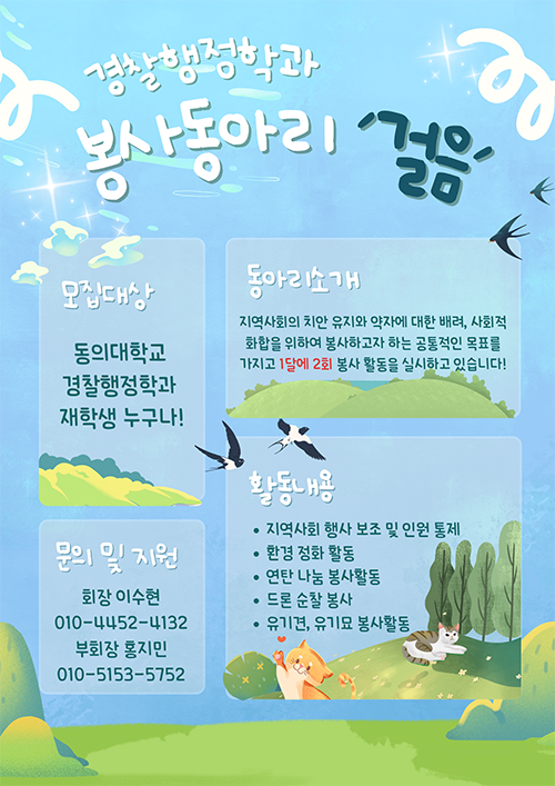 동의대학교 경찰행정학과는 선후배들간 즐겁게 교류하고 체험ㆍ활동할 수 있는 다양한 동아리가 있습니다