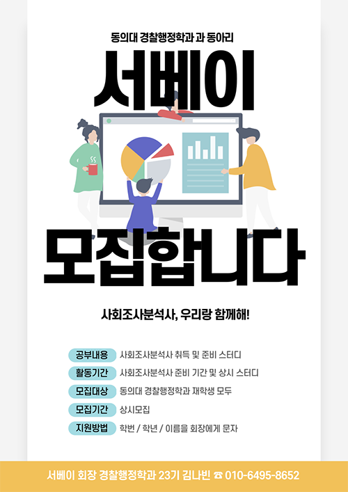 "서베이"는 경찰행정학과 학생들 중, 사회조사방법론, 통계학에 관심이 있는 학생들이 만든 동아리입니다. 특히, 다양한 사회정보의 수집·분석·활용을 담당하는 자격증으로 관심을 받고 있는 사회조사분석사 시험를 통해 사회조사방법론에 대한 이해를 돕고자 합니다. 사회조사분석사는 기업, 정당, 지방자치단체, 중앙정부 등 각종 단체의 시장조사 및 여론조사 등에 대한 계획을 수립하고 조사를 수행하며 그 결과를 분석, 보고서를 작성하는 전문가로 '사회조사방법론'은 물론이고 자료분석을 위한 '통계지식', 통계분석을 위한 '통계패키지 프로그램' 이용법 등에 대한 이해가 필수적입니다.