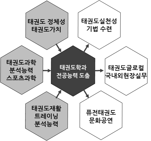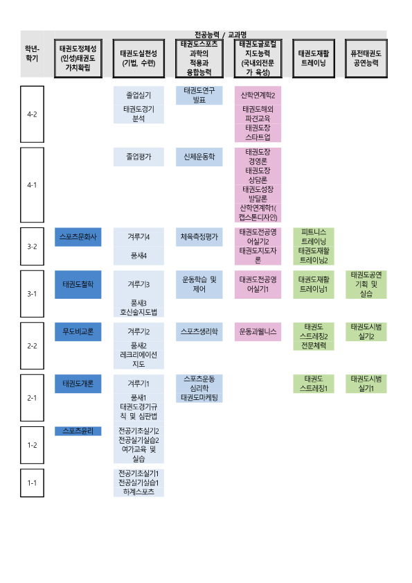 글로벌 태권도 인재 양성 교육과정 편성으로 태권도 융, 복합 인재 양성에 부응하는 맞춤형 교과목을 개발하였습니다.