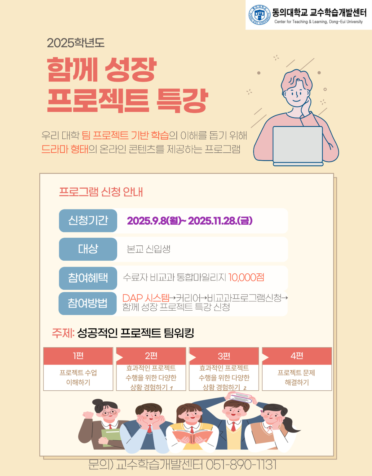 교수학습개발센터의 학습지원 프로그램인 2025학년도 함께 성장 프로젝트(학습) 특강을 다음과 같이 안내하오니 많은 신청 바랍니다.